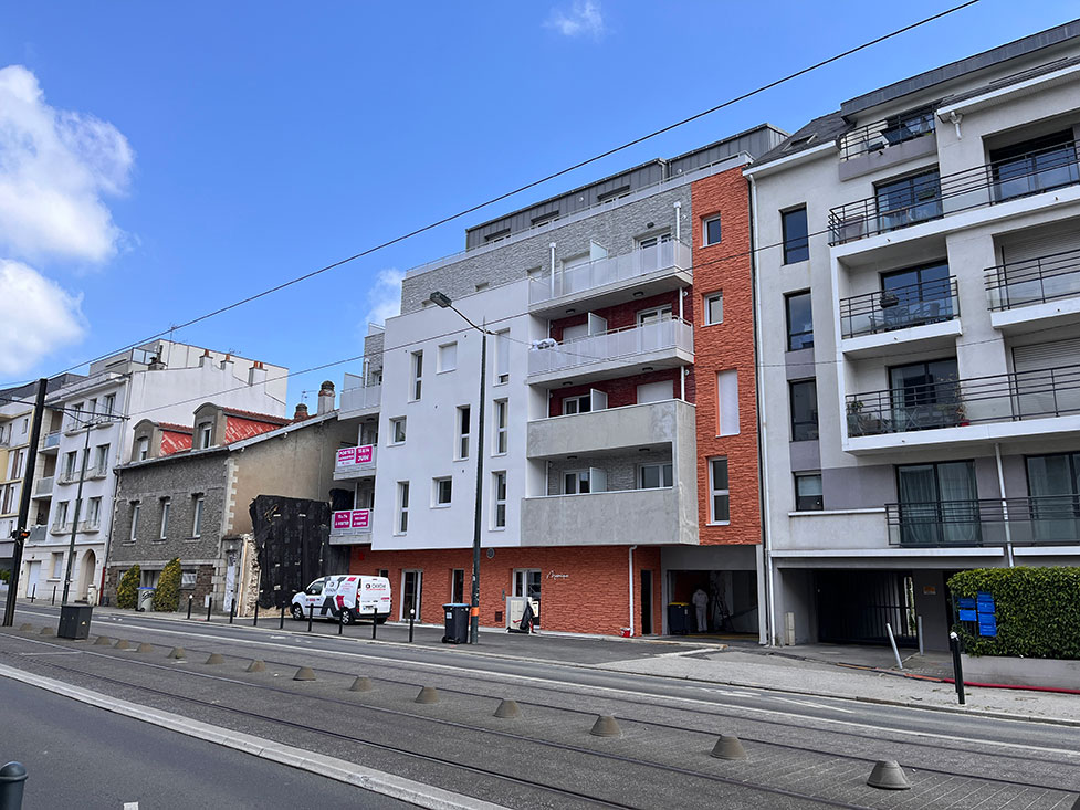 « Le CISN se propose de réaliser une opération de 17 logements et un local commercial au cœur du quartier Sainte-Thérèse à Nantes.A proximité des transports en commun et notamment du tramway, le quartier est largement desservi en commerces et participent à l’emplacement et à la qualité de vie des logements.L’orientation Est / Ouest des logements permet d’apporter de la lumière naturelle et profite aux logements traversants.Le fond de parcelle existant et ses arbres permettent également de conserver un ilot de fraicheur côté jardin.Ce projet se veut de qualité tant dans sa situation que dans ses prestations ; un travail de façades a été réalisé pour que l’immeuble marque la rue dans une écriture architecturale contemporaine, texturée, pour dynamiser les différentes strates de logements. Le volume du bâtiment se termine par un retrait en attique pour dégager de larges terrasses pour les logements supérieurs. La composition des façades structurées en séquences, par le jeu de façades enduites, matricées et habillées de métal pour l’attique, tout en répondant à un souci d’harmonie de traitement, fait appel à un vocabulaire architectural volontaire dans le cadre d’une intégration respectueuse et réussie. »