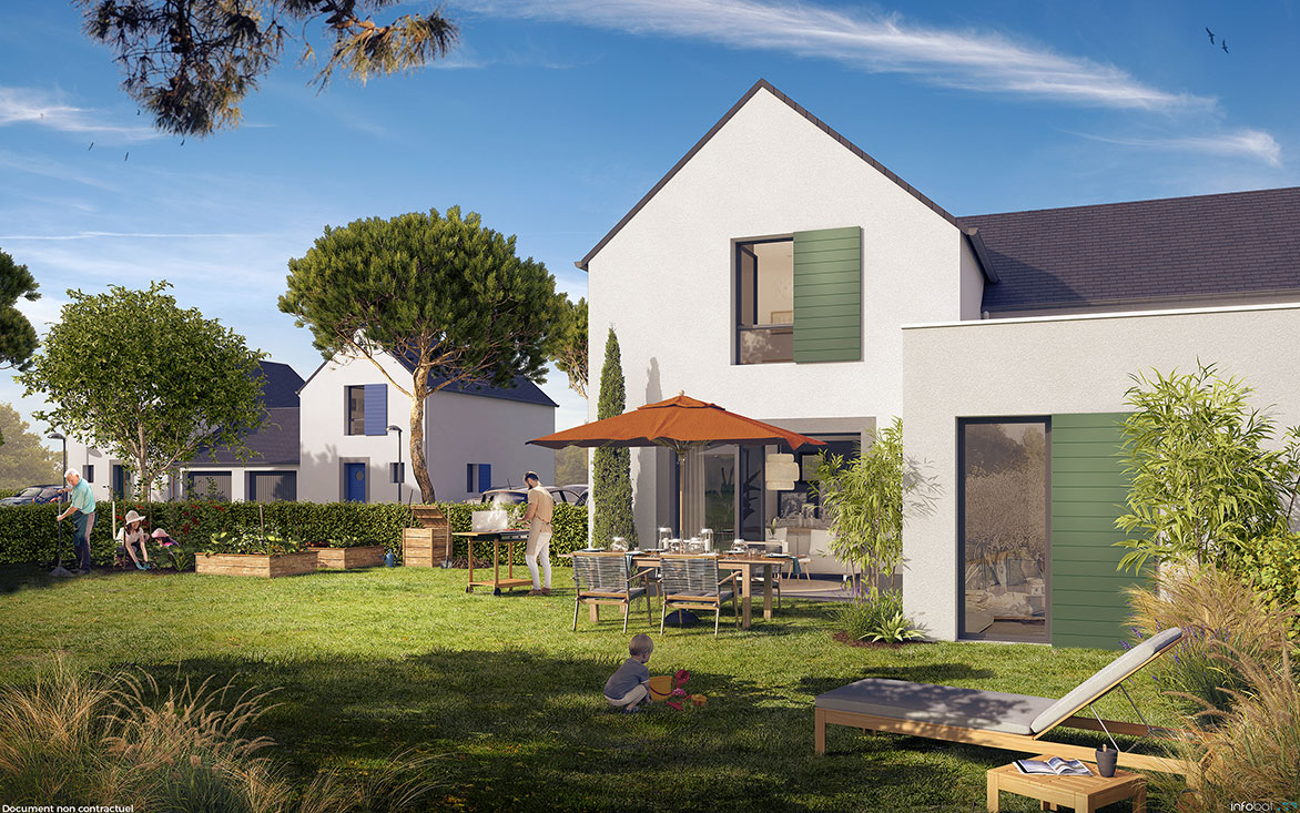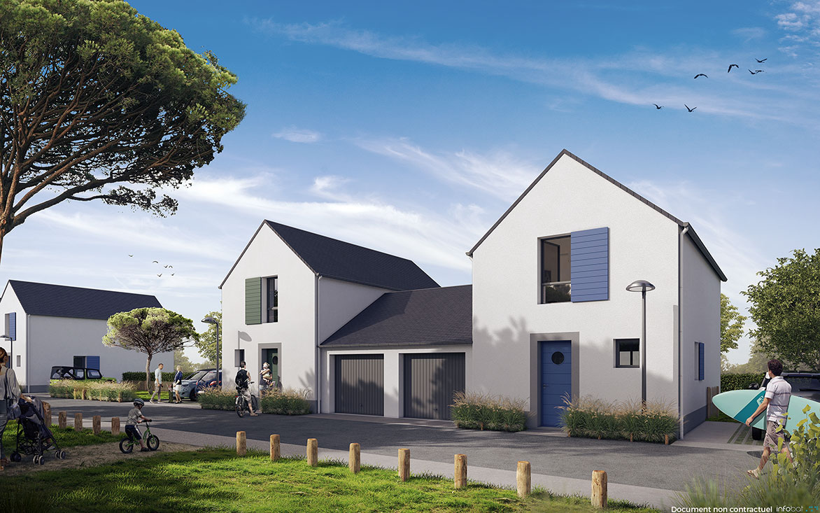 Une situation privilégiéeSituée au sud de la Bretagne, à la pointe de la Presqu’île Guérandaise, Piriac-Sur-Mer est une petite station balnéaire labéllisée « Petite Cité de Caractère » par son riche patrimoine naturel, culturel et architectural.Ses petites ruelles sinueuses abritent de majestueuses demeures de granit élégamment fleuries d’hortensias qui ont séduit de célèbres écrivains tels que Flaubert ou Zola.La Baie du Rocher BleuÀ proximité immédiate de la Côte Sauvage et des plages, le projet Rocher Bleu bénéficie d’une situation unique. Au coeur d’un environnement pavillonnaire calme, les futures maisons sont entourées d’espaces verts boisés.À seulement 600 mètres, les adeptes de promenades pourront rejoindre la baie du Rocher Bleu offrant un sublime panorama de la pointe du Croisic à la Pointe de Saint-Gildas de Rhuys. Par temps clair, on aperçoit les îles de Houat et Hoëdic.