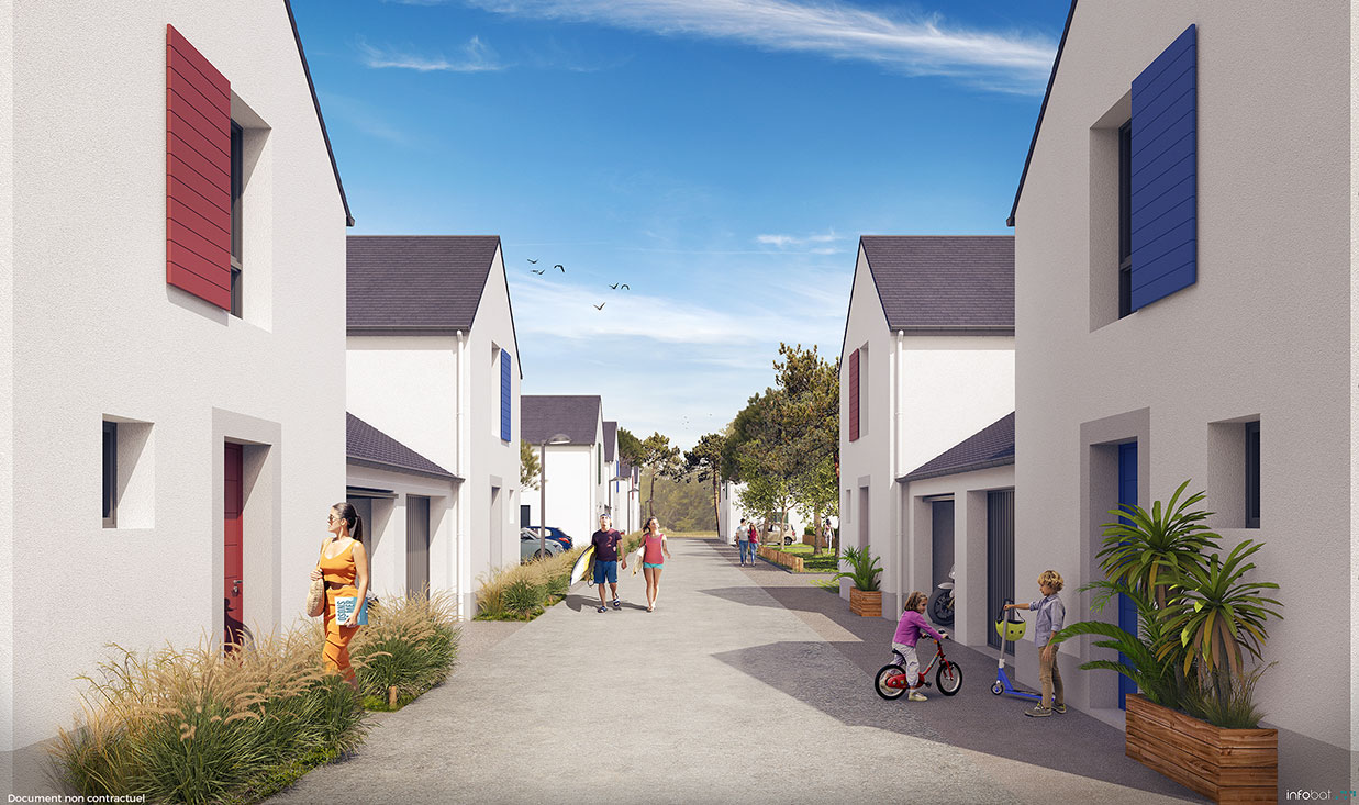 Des matériaux de qualité ont été privilégiés pour un réel confort d’usage. Chaque maison est personnalisée notamment par trois modèles de portes d’entrée colorées : en rouge dit « guérandais », très présent dans le bourg, en bleu, clin d’œil à l’océan et en vert en référence à l’environnement verdoyant du lotissement.