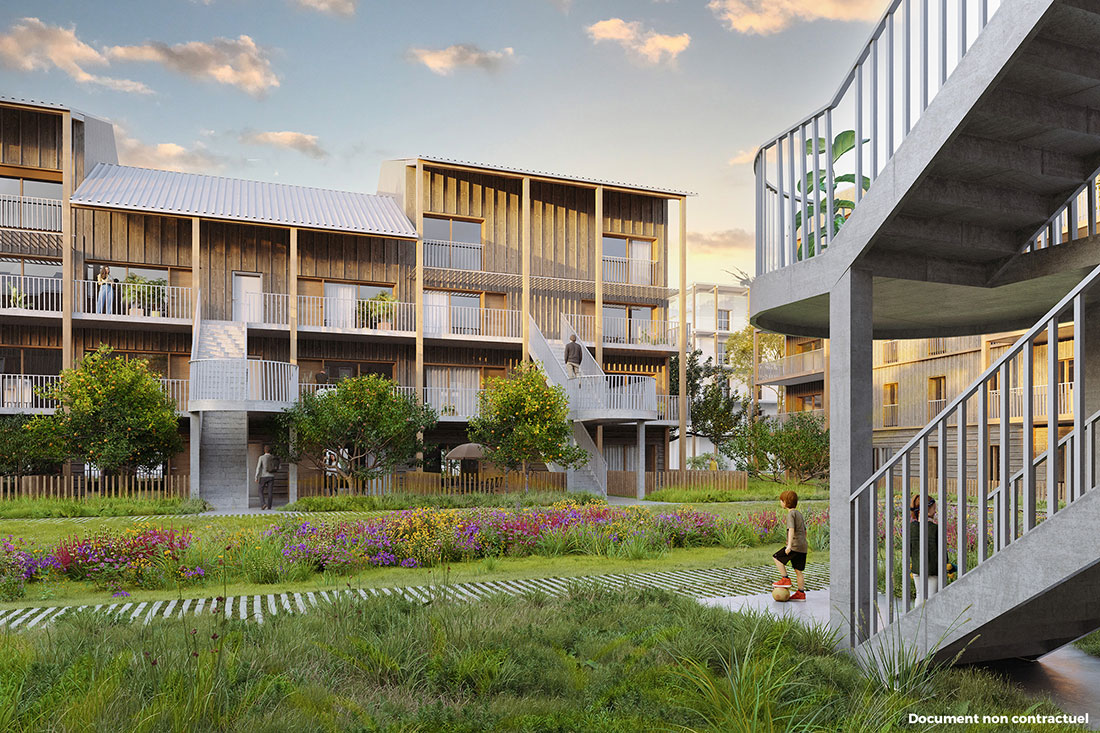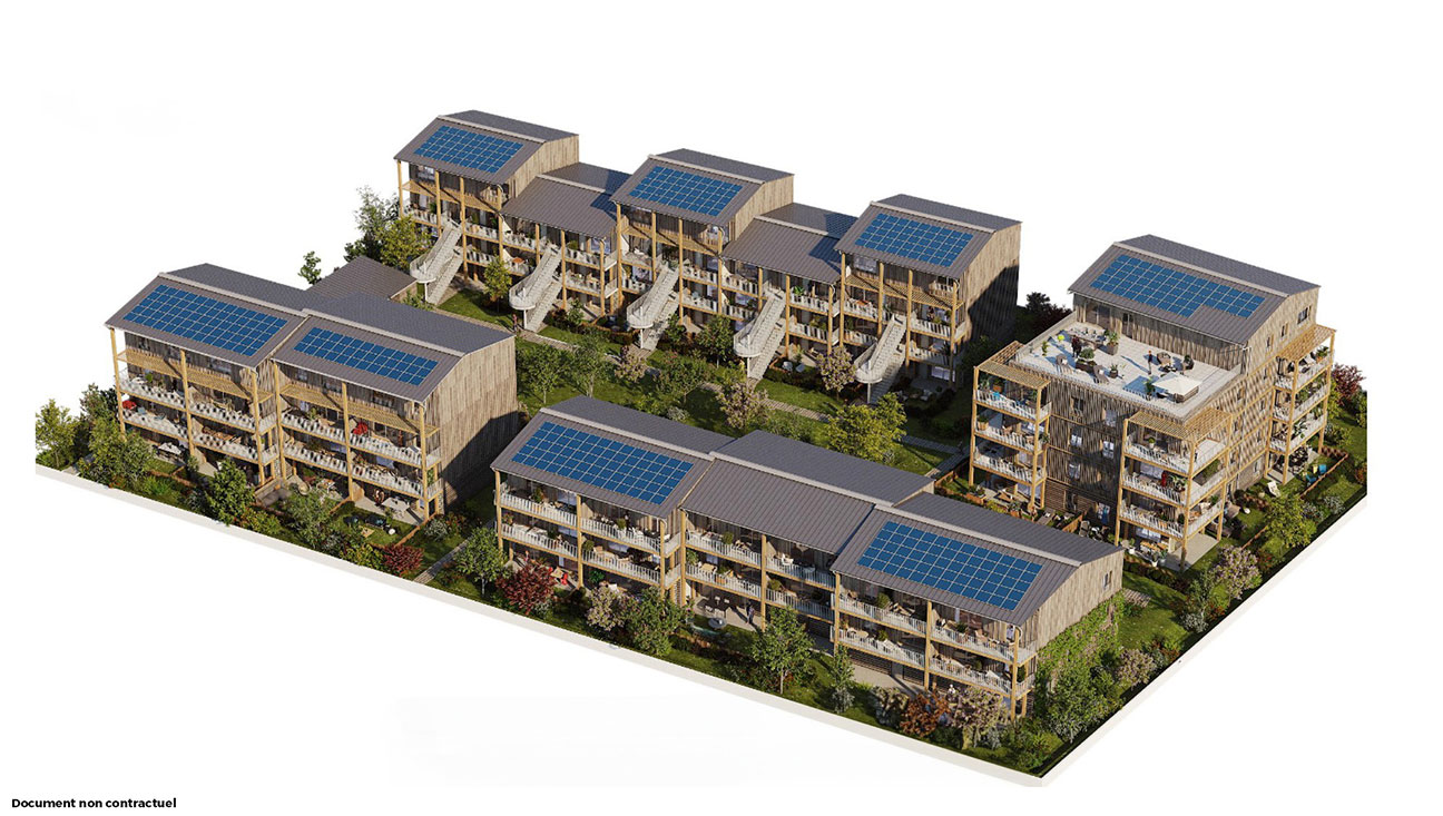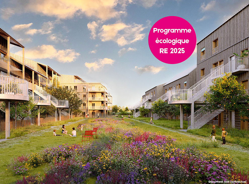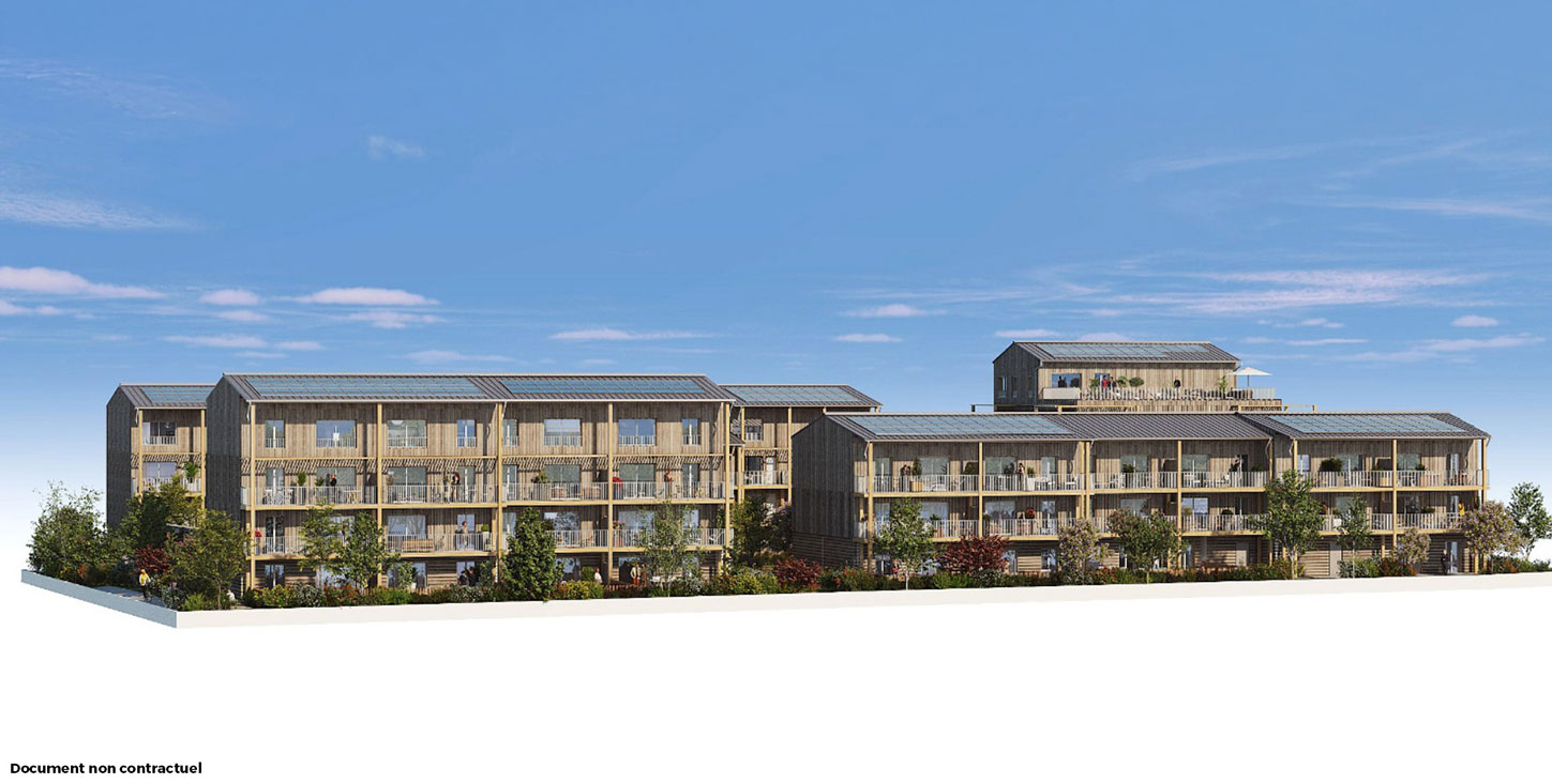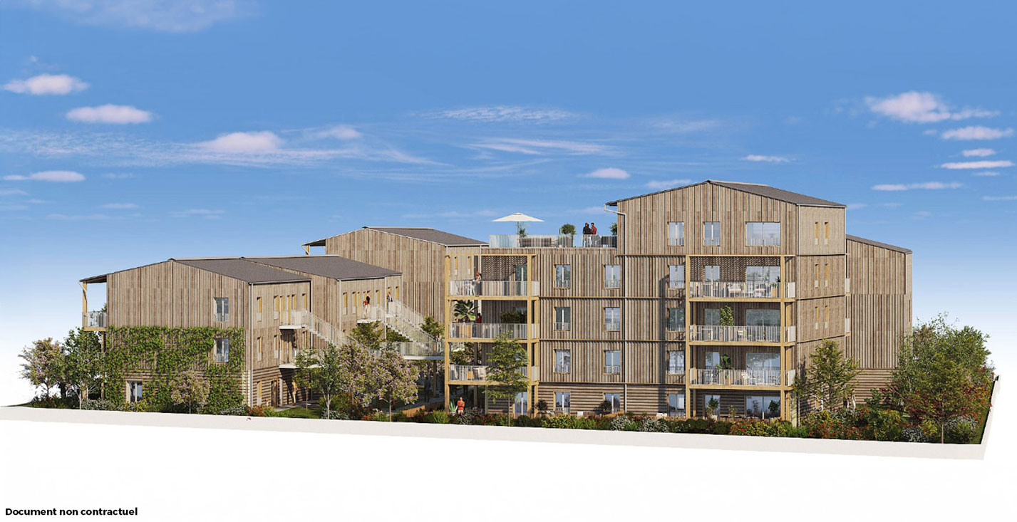 L’Azuré, un programme exemplaire de 34 logements RE2025 du T2 au T5 qui privilégie la sobriété et porte de fortes valeurs et de fortes ambitions écologiques au cœur de l’écoquartier Bongraine, à l’emplacement d’une ancienne friche ferroviaire le long du littoral à Aytré, proche de La Rochelle.